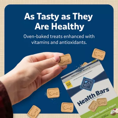 - MADE WITH APPLES: BLUE Health Bars dog treats prove that a healthy treat can be tasty, too. With ingredients like oatmeal, apples and yogurt, they feature the ingredients youll be proud to feed your furry family members