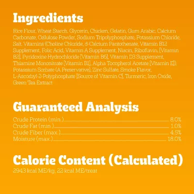 | Active Ingredients | Rice Flour, Wheat Starch, Glycerin, Chicken, Gelatin, Gum Arabic, Calcium Carbonate, Cellulose Powder, Sodium Tripolyphosphate, Potassium Chloride, Salt, Vitamins |
