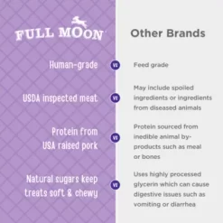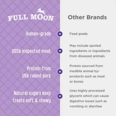 - U.S.-GROWN PORK: Full Moon treats are proudly made in the United States using regionally sourced ingredients, including USDA-certified all natural pork raised on family farms.
