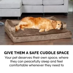 - Side bolsters on the comfy couch dog bed help align your pet’s spine and neck