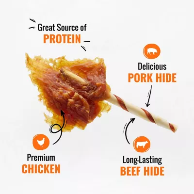 - THREE FLAVORS DOGS LOVE: Made from pork hide and rawhide, then wrapped with real chicken.