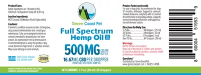- 500 mg CBD per bottle/8.33 mg CBD per 1 mL dropper from full spectrum hemp oil