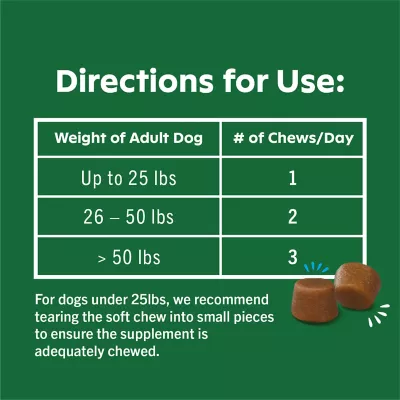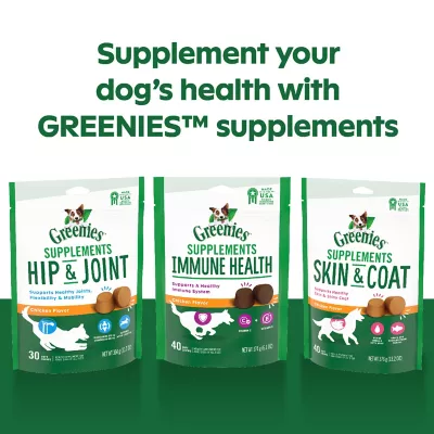 Formulated with a blend of Glucosamine, Chondroitin, Manganese and Ascorbate to help your dog continue to be active. GREENIES Supplements combine active ingredients especially formulated to meet your dog’s needs with irresistible chicken flavor. Simply give once a day to help your dog be at their best and enjoy happy days together.