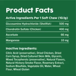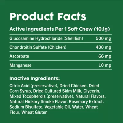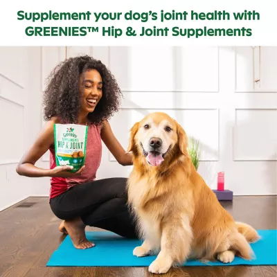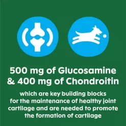 - SUPPORTS HEALTHY JOINTS, FLEXIBILITY & MOBILITY: GREENIES Hip & Joint Supplements are designed to help your adult and senior dog continue to be active ACTIVE INGREDIENTS: Each irresistible soft chew is formulated with 500 mg of glucosamine & 400 mg of Chondroitin that are key building blocks for maintenance of healthy joint cartilage