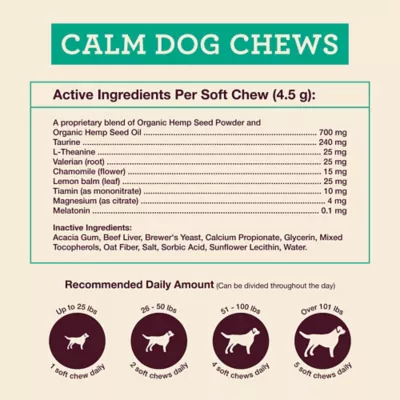 - Calming dog chews deliver the perfect ratio of Omega-3 and Omega-6 fatty acids in an easy to administer soft chew form