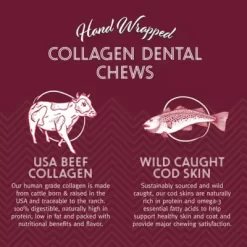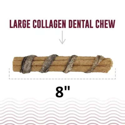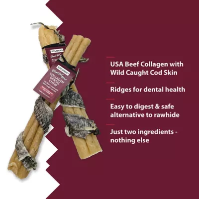 100% Pure Icelandic+ Beef Collagen Dental Chews with Spiral Wrapped Fish Skin 8″ Dog Treat. Made of USA Beef Collagen and Atlantic Cod Fish Skin. Ridges for Dental Health. Rich in Omega-3 Essential Fatty Acids. Long-Lasting Chew with Multiple Layers. Reduce tartar & plaque build-up for healthier gums and teeth. Safe alternative to rawhide. 100% Edible so it is easy to digest. 100% Natural, no additives, no preservatives, no supplements. 100% Two ingredient dog treat. 100% awesome treat for your pet! Icelandic+ Beef Collagen Dental Chews with Spiral Wrapped Fish Skin Dog Treats are available in an 8″ size. Each package contains 1 dental chew. The Collagen Chews are Hand Wrapped and come from USA Beef and Wild Caught Atlantic Cod Skin. The Wild Caught Atlantic Cod Skins are sustainably sourced and are naturally rich in protein and omega-3 essential fatty acids to help support healthy skin and coat and provide major chewing satisfaction. Dental Care: The Icelandic+ Beef Collagen Dental Chews with Spiral Wrapped Fish Skin Dog Treat is a natural chew that helps your dog’s gums to be “brushed” as it is made extruded beef collagen and naturally dried cod skin. If your dog’s teeth are not regularly brushed, you may experience some gum bleeding with their first chew. This is natural and is actually a benefit as the chews surface is “scrubbing” the gum line. With continued use and additional chews, you will see a difference in the health of your dog’s gum line and whiter teeth. People who do not floss similarly experience gum bleeding when they first start and the bleeding stops when gum health improves from flossing, as will happen with your dog. Both you and your veterinarian will be pleased with the change in gum health and appearance of teeth over time. Important: As with all dog chews, always supervise while your dog is enjoying an Icelandic+ Beef Collagen Dental Chews.