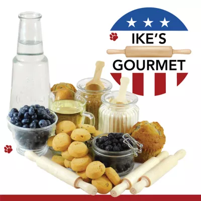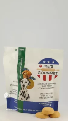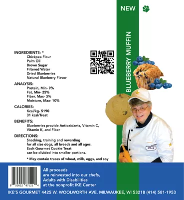 Vegan Grain-Free using Natural Gluten-Free Ingredients, Sustainable and Responsibly Sourced. No Artificial Flavors, Colors, or Preservatives. Non-GMO. Ingredients*: Chickpea Flour, Palm Oil, Brown Sugar, Filtered Water, Dried Blueberries and Natural Blueberry Flavor Made in the U.S.A. Handmade, Kitchen Crafted, Slow Cooked, Artisanal Inspire, Oven-Baked in Small Batches. Gourmet Dog Treat Cookies – Net Wt. 8 oz. (227 g.) Each Treat is 1.5 Inches wide. Resealable and Reusable Pouch. Health Benefits: Antioxidants, Vitamin C, Vitamin K, and Fiber Guaranteed Analysis: Protein (crude) 9% (min), Fat (crude) 25% (min), Fiber (crude) 3% (max), Moisture 10% (max) Calorie Content: 5190 kcal/kg, 31 kcal/Treat Directions: Snacking, Training and Rewarding for Dogs of All Sizes, All Ages and All Breeds. Each Treat can be divided into smaller portions as desired. All proceeds are reinvested into our chefs, Adults with Disabilities at the nonprofit IKE Center * May contain traces of wheat, milk, eggs and soy