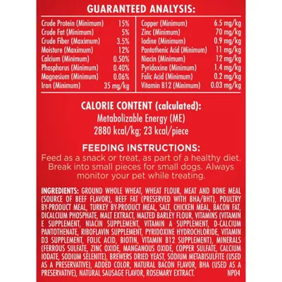 - Contains one (1) seven pound box of small dog biscuits in 5 tasty flavors: beef, turkey, chicken, bacon and sausage (packaging may vary)