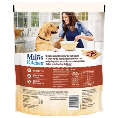 Sometimes a nice steak is the best way to say, “I love you.” And when it comes to your pup and giving him the very best, Milo’s Kitchen Steak Grillers beef dog treats will show him that you care every daywhether at treat time or for a special snack. Made with real Angus steak, you never have to worry about meat by-product or fillers in these tasty treats. One Milo’s Kitchen fur mom says, “With four dogs, it can be hard to find something they all like, but these chewy dog treats are something they all seem to agree on!” These meaty little strips look like real steak and have the delicious taste of high-quality beef and no artificial flavors or colors. At Milo’s Kitchen, we believe in making dog food with the same high-quality ingredients that you want in your own meals, so our treats are always made with 100% real meat as the first ingredient. Give them to your pup today to see why they’re totally pawsome!