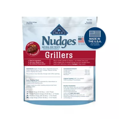 - PACKAGING MAY VARY: Contains one (1) 16 oz. bag of BLUE Nudges Grillers Natural Dog Treats, Steak