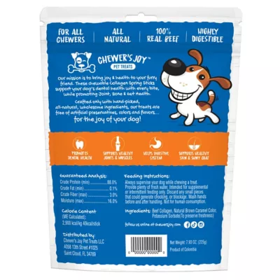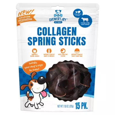 Chewable Collagen Spring Sticks treats for dogs are high in protein, promote strong joints, bones, and muscles, boost digestive system, support skin well-being and beautiful shiny coats. Long lasting chewing action promotes dental hygiene.