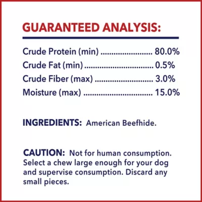 Feeding Instructions: Beefhide is not a food, but is a safe chewable toy that can be, and most often is, consumed. It is 80-85% protein, 10-12% fiber and moisture, and 1-2% fat. Beefhide is high in protein and low in fat, especially when compared to pig ears and other pork skin products. Beefhide has fewer calories per ounce than a typical dog biscuit. One or two hours of daily chewing are sufficient for most dogs.