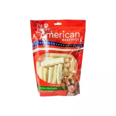 Feeding Instructions: Beefhide is not a food, but is a safe chewable toy that can be, and most often is, consumed. It is 80-85% protein, 10-12% fiber and moisture, and 1-2% fat. Beefhide is high in protein and low in fat, especially when compared to pig ears and other pork skin products. Beefhide has fewer calories per ounce than a typical dog biscuit. One or two hours of daily chewing are sufficient for most dogs.