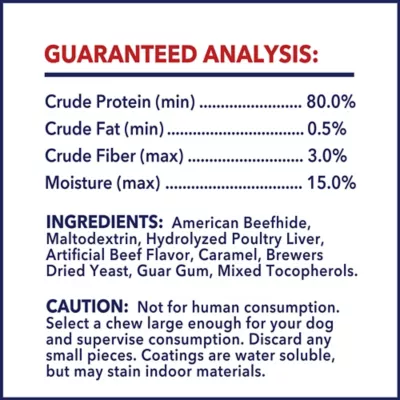 Feeding Instructions: Beefhide is not a food, but is a safe chewable toy that can be, and most often is, consumed. It is 80-85% protein, 10-12% fiber and moisture, and 1-2% fat. Beefhide is high in protein and low in fat, especially when compared to pig ears and other pork skin products. Beefhide has fewer calories per ounce than a typical dog biscuit. One or two hours of daily chewing are sufficient for most dogs.