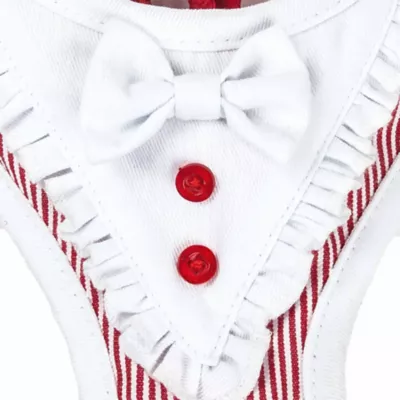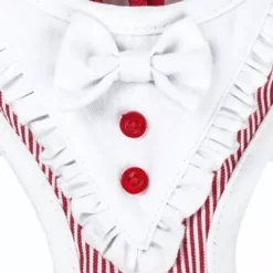 - Features a Stunning white Bowtie with Accented buttoned trims underneath with added ruffles that coordinate effortlessly with the Candy stripe body print. Looks great as a Summer or Year-Round Mock Dress