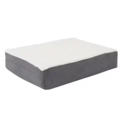 - PRODUCT DETAILS – Materials: Sherpa, Microsuede, Polyurethane Foam, and Memory Foam. Dimensions: (L) 44″ x (W) 35″ x (H) 4.75″. Supports Dogs Weighing Between 65 and 100lbs. Works on Floors, in Cars, and as Dog Crate Bed.
