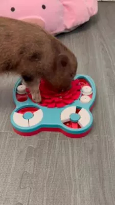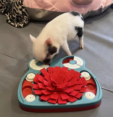 Piggy Poo and Crew Hide and Slide Snuffle Mat Treat Game has a unique design with a snuffle mat attached to a slow feeder game. Just hide some treats inside. The snuffle mat can be removed from underneath to offer your pet another game with a smooth lick surface. This game is recommended for small pets. Great game to bring for travel or a small pen.