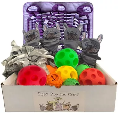 This pet ball and toy box is a collection of treat balls and toys that will make for a happy pet and a happy owner. Includes an 18 in. x 20 in. snuffle mat with a nonskid back, 4 large treat-dispensing balls in a variety of colors, 4 French Bulldog paper crinkle squeaker toys, 2 small challenging treat balls, 2 large balls, and a snuffle rattle treat ball. A total of 14 items. Also makes a great gift for the pet lover in your life.