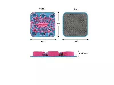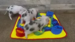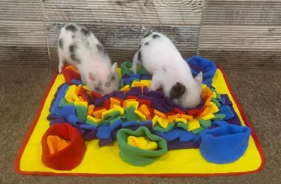 Enjoy the Piggy Poo and Crew Mat Four Pack. Included is a rainbow, pink and blue, gray, and purple 18 in. x 20 in. mat. Fun activity mats to keep your pet busy. Pets require physical and mental stimulation to meet their needs. Rooting/nudging is a natural behavior and shouldn’t be discouraged. Just throw some dry pellets or treats on this mat or tuck them under the flaps. Your pig or other pet will be occupied searching until every last tasty treat has been found.