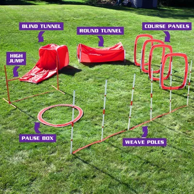 - Includes weave poles, course panels, round Tunnel, Blind Tunnel, adjustable high jump, and pause box