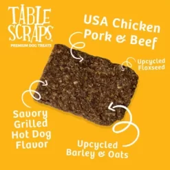 - Table Scraps dog treats have a savory grilled hot dog aroma that your dog will come running for every time