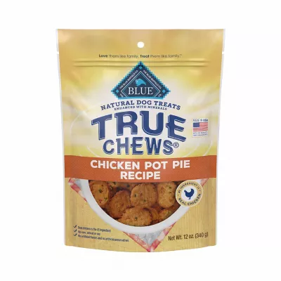 - PACKAGING MAY VARY: Contains one (1) 12 oz. bag of BLUE True Chews Premium Natural Dog Treats, Chicken Pot Pie