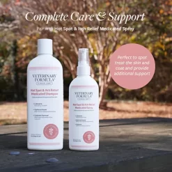 - HEAL & SOOTHE Veterinary Formula Clinical Care Hot Spot and Itch Relief Shampoo provides dogs and cats with medicated analgesic and anti-inflammatory relief of itchy skin and hot spots commonly caused by allergies, insect bites, dirty coats & more.