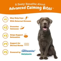 - Advanced Calming Bites feature Suntheanine, a clinically studied and super premium form of L-Theanine that helps promote a sense of relaxation and calmness for your pup.