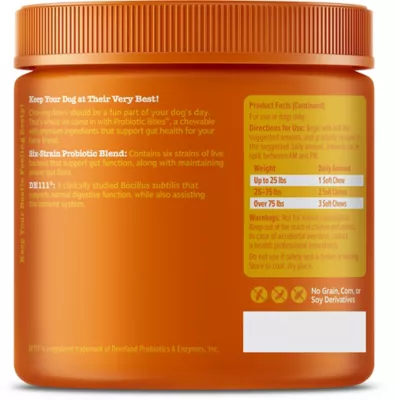 - These functional soft chew supplements have a base of pumpkin and papaya (a source of enzymes) plus probiotics for digestion, bowel, and immune support to care for canine pets.