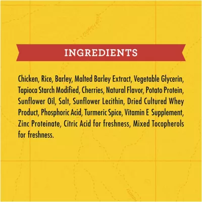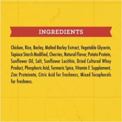 - Healthy dog treats made with natural ingredients like real chicken and whole food berries